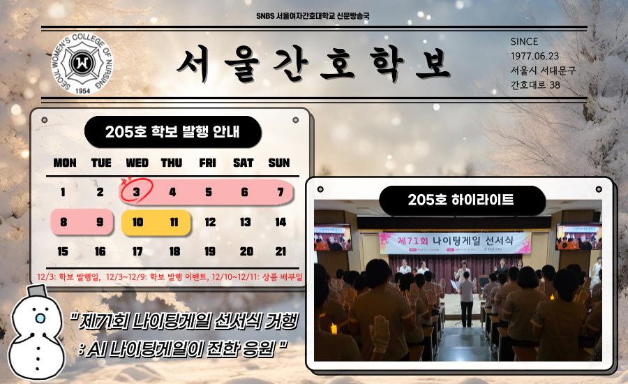 제71회 나이팅게일선서식 개최 서울여자간호대학교(총장 김숙영) “제71회 나이팅게일 선서식”이 지난 11월 19일(수), 제3강의관 나이팅게일홀에서 진행되었다. 나이팅게일 선서식은 2학년 학생들이 임상실습을 앞두고 간호전문인으로서 책임과 의무를 되새기며 나이팅게일의 정신을 계승하겠다는 다짐을 밝히는 자리이다.이날 행사에서 2학년 선서생들은 대한간호협회 학생 간호사 휘장을 지도교수로부터 수여받고, 우리 대학 제55대 나이팅게일로부터 전달받은 불씨를 나누며 헌신과 봉사의 가치를 마음에 새겼다. 이후 김숙영 총장과 총동문회장, 교무위원, 교수 및 내외귀빈 앞에서 나이팅게일 선서를 낭독하며 간호사로서의 헌신과 사명을 다졌다.김숙영 총장은 “실습을 앞두고 걱정과 불안이 있겠지만, 따뜻한 눈빛과 진심 어린 태도, 환자를 향한 존중의 마음이 있다면 훌륭한 간호사로서 성장할 수 있다”며 학생들을 격려하고, 앞으로의 여정에 응원과 지지를 전했다. 이어진 축사에서 한형숙 총동문회장은 “나이팅게일의 등불을 마음에 품은 빛을 지닌 간호사가 되길 바란다”며 간호사로서의 첫걸음을 딛는 선서생들에게 축하를 보냈다.이번 선서식에서는 AI 기술을 활용해 제작된 나이팅게일의 축하 영상이 상영되어 자리에 의미를 더했다. 폐회사 및 기념 촬영을 끝으로 선서식은 마무리됐다.
