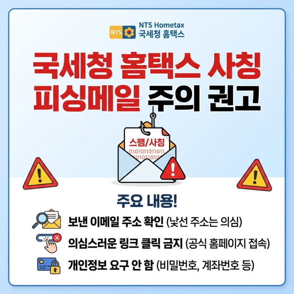 국세청 홈택스 사칭 피싱메일 주의 권고