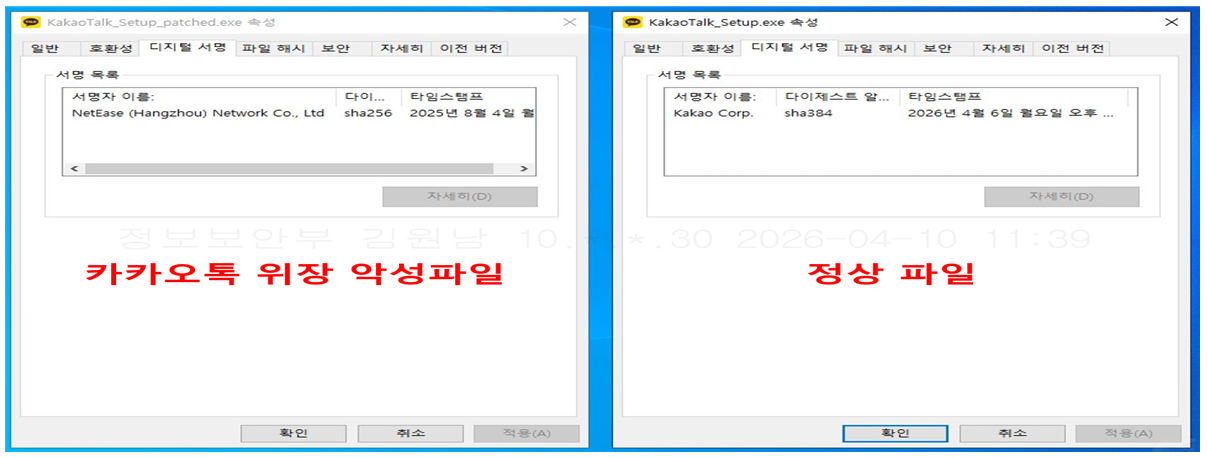 - 설치파일 마우스 우클릭 → 속성 → 디지털 서명 → ‘Kakao Corp.’ 확인