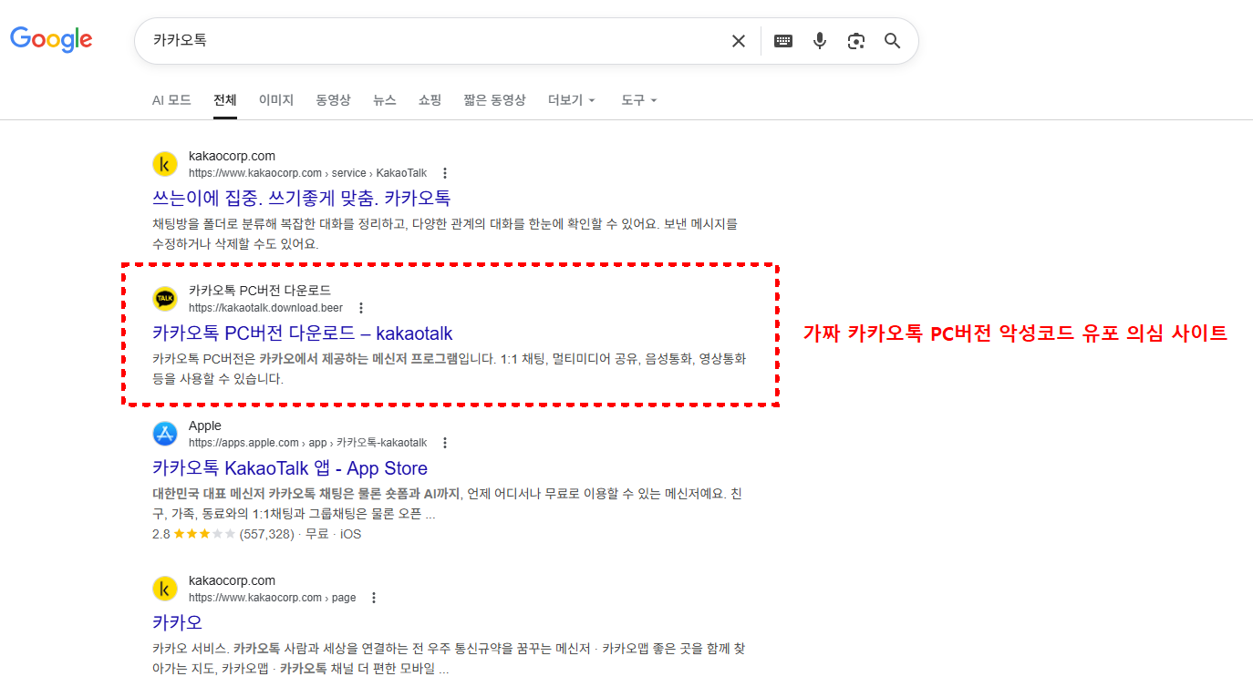 - ‘카카오톡 PC버전’을 검색할 경우, 공식 다운로드 페이지로 위장한 피싱 사이트가 상단에 노출되어 다운로드를 유도